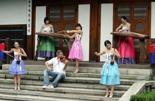 퓨전국악그룹 율(律[yul])과 세계적인 바이올리니스트 데이빗 가렛이 SBS 대하사극 ‘왕과 나’의 OST 뮤직비디오 촬영에서 환상적인 선율을 선보여 눈길을 끌었다. 이들은 지난 13일 서울 연희동의 군스튜디오에서 진행된 합주 녹음에 이어 광복절이던 15일 성북동 삼청각에서 국악과 바이올린의 환상적인 멜로디를 카메라 앞에서 연출했다. 이들이 함께 참여하는 곡은 ‘왕과 나’의 주인공인 오만석(극중 처선 역)의 러브테마. 한국의 전통 국악과 서양 악기인 바이올린이 적절하게 조화를 이뤄 감각적인 선율이 두드러지는 곡이다. 음악 실력은 물로 각 멤버들의 미모로도 화제를 모으고 있는 율은 이날 아름다운 빛깔의 퓨전 한복을 입고 촬영에 임해 지나던 시민들의 시선을 한눈에 사로잡았다. 이작 펄먼의 수제자이기도 한 데이빗 가렛은 13살이란 어린 나이로 세계 최고의 음반사 도이치 그라모폰(DG)와 전속 계약을 맺어 큰 화제를 모았던 천재 바이올리니스트. 190cm의 훤칠한 키와 ‘꽃미남’ 외모를 가진 데이빗 가렛또한 이날 뮤비 촬영장에서 율 못지않은 외모 이상의 아름다운 선율을 선보이며 감탄을 자아냈다. 이번 ‘왕과 나’의 OST는 CF 감독 경력과 함께 SBS ‘마이걸’ ‘마녀유희’ ‘칼잡이 오수정’ 등의 음악을 맡은 오준성 감독이 촬영을 맡았다. ‘왕과 나’의 제작사 ㈜올리브나인의 한 관계자는 “한류 시장에서 우리 드라마의 인기가 높아지면서 OST에 대한 해외 팬들의 관심도 높아지고 있다. ‘왕과 나’ 역시 한류 시장의 폭발적인 관심을 이끌어 낼 수 있을 것으로 기대하고 있다”며 “율과 데이빗 가렛의 참여는 전통적인 선율 위에 모던한 스타일이 조화를 이뤄내 ‘왕과 나’의 OST를 보다 세계적인 수준으로 끌어올려 OST로도 한류시장을 선도하겠다는 데 그 목적이 있다”고 전했다. 조선시대 문종 때부터 연산군을 섬긴 환관 김처선의 삶과 사랑을 다룰 대하사극 '왕과 나'는 '강남엄마 따라잡기'의 후속으로 오는 8월 27일 SBS에서 첫 방송될 예정이다. yu@osen.co.kr