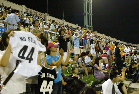 LG 트윈스가 끝까지 포기하지 않는 ‘끈끈한 야구’로 팬들을 열광시키고 있다. 4강행에 사활을 걸고 있는 LG는 최근 경기서 막판 뒤집기를 잇달아 연출하며 4위 한화를 1.5게임차로 바짝 추격하며 마지막 불꽃을 태우고 있다. 극적인 역전승이 잇달으면서 팬들의 발길도 야구장으로 향하고 있다. LG 팬들은 요즘 ‘끈끈한 야구’를 펼치는 선수단을 응원하기 위해 열성적이다. 주초 현대와의 원정 3연전은 LG 팬들의 열성을 볼 수 있는 대표적인 경기였다. LG 팬들은 수원까지 원정응원으로 홈팬들을 압도했다. 1루 홈팀 팬들보다도 더 많은 팬들이 원정팀 응원석인 3루측을 채우며 선수들을 열렬히 응원했다. 원정 첫 날인 지난 21일은 갑작스럽게 한낮(오후 2시) 경기로 편성됐음에도 불구, 서울에서 응원 온 LG팬들이 꽤 됐다. 이날 관중 1037명 중 절반 이상이 LG 팬들이었다. 이들은 뜨거운 햇볕이 내리쬐는 관중석을 마다하지 않은 채 LG 선수들이 19일 잠실 삼성전서 3-8의 열세를 딛고 막판 역전승을 이끌어낸 감격을 재현하기를 고대했다. 비록 21일 경기에서는 막판 역전 허용으로 8-9로 아깝게 패했지만 다음날인 22일에도 1226명 관중의 절반넘은 LG팬이 자리를 지키며 응원했다. 이에 선수들은 끝까지 포기하지 않고 경기에 최선을 다해 9회 최동수의 만루포로 짜릿한 역전승(7-5)을 거뒀다. 그러자 다음날인 23일에는 더 많은 LG팬들이 수원야구장을 찾았다. 이날은 총관중이 1931명이었다. 수원구장 3연전이 낮 경기가 포함된 평일 3연전이었음에도 LG팬들의 높은 관심으로 평균 이상을 기록한 것이다. 팬들의 열성적인 응원에 힘입은 LG는 23일에는 8-1로 완승을 거두는 등 이번 현대와의 주초 3연전서 2승 1패를 마크하며 4위 한화를 바짝 추격할 수 있는 발판을 마련한 것이다. 선수단이 끝까지 포기하지 않고 막판 역전승을 이끌어내는 것에 팬들의 관심이 고조되고 있다. ‘선수들이 포기하지 않는 한 팬들도 포기하지 않는다’는 롯데팬들의 응원문구처럼 LG팬들도 LG의 4강행을 고대하며 응원에 열을 올리고 있다. 과연 LG 선수단이 팬들의 성원에 보답하며 4강행을 이뤄낼 수 있을지 주목된다. sun@osen.co.kr 4강행을 기원하며 마치 포스트시즌을 방불케 할 정도로 수원 원정 응원을 온 LG 팬들.