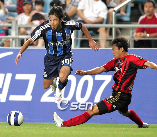 '3전4기는 끝내 실패로, 득점없이 무승부'. 울산 현대와 FC 서울이 득점없이 0-0으로 무승부를 기록, 무승 행진을 4경기째 이어갔다. 25일 오후 7시30분 울산 문수 월드컵경기장에서 열린 울산과 서울의 2007 삼성 하우젠 K리그 18라운드에서 양팀은 초반부터 팽팽한 공방전을 벌였으나 끝내 득점을 올리는데 실패했다. 이로써 홈팀 울산은 최근 4경기 연속 무승부를 이어가며 7승8무3패를 기록했고, 서울 역시 4경기 연속 무승(3무1패)행진을 벌이며 4승11무3패의 저조한 성적에 머물렀다. 마차도가 지난 경기 퇴장으로 엔트리서 제외됐고, 미드필더 오장은마저 발목 부상으로 빠져 선발 라인업 구축에 애를 먹은 울산은 이천수와 우성용을 투톱으로 내세워 서울의 문전을 공략했지만 김병지가 지키는 골문은 좀처럼 열리지 않았다. 오히려 김한윤과 윤홍창이 각각 경고 누적(3회)과 퇴장으로 빠진 서울은 아디와 김진규가 굳게 버티는 디펜스를 강화하는 전략을 바탕으로 몇 차례 역습을 시도, 상대의 간담을 서늘케 했다. 그러나 양팀 모두 뚜렷한 득점 찬스는 얻지 못했다. 울산은 후반 19분 몸상태가 좋지 않았던 이천수를 빼고, 이진우를 투입해 승부수를 띄웠지만 결국 골망을 가르지 못해 0-0 무승부에 만족해야 했다. yoshike3@osen.co.kr 울산 이천수가 서울 최원권의 태클을 점프로 피하며 드리블하고 있다. /울산=황세준 기자 storkjoon@osen.co.kr