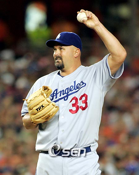 27일(한국시간) 뉴욕의 셰이스타디움에서 벌어진 뉴욕 메츠와 LA 다저스의 경기서 다저스의 선발투수 데이빗 웰스가 1회말 투구를 시작하기에 앞서 팔을 풀고 있다. 최근 샌디에이고서 방출된 뒤 다저스와 계약한 웰스는 5이닝 7피안타 2실점으로 승리투수가 되면서 복귀전서 시즌 6승째를 올렸다. /셰이스타디움(뉴욕)=주지영 특파원 jj0jj0@osen.co.kr