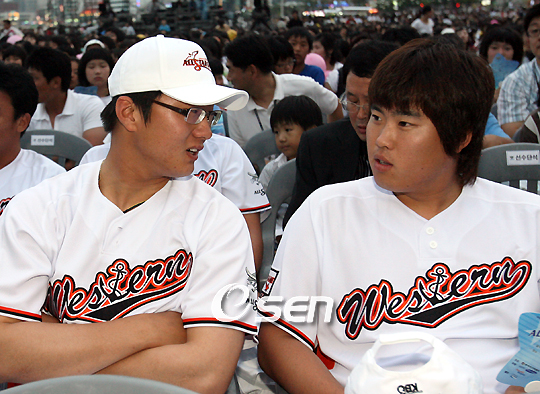 서로 다른 길을 가고 있다. 지난해 거물루키로 나란히 주목을 받은 한화 류현진(20)과 KIA 한기주(20). 야구계는 모처럼 나타난 거물급 투수들에게 매료됐다. 실제로 이들은 기대에 걸맞는 활약을 보였고 한국야구의 미래를 짊어질 투수로 각광을 받았다. 류현진은 투수 3관왕을 차지하며 신인왕과 MVP를 동시 석권했다. '괴물'이라는 칭호를 얻으며 단숨에 최고의 반열에 올랐다. 한기주는 초반 부진했으나 후반기부터 미들맨으로 변신, 팀을 4강에 끌어올렸다. 하지만 한기주가 누린 관심과 인기는 류현진에 미치지 못한 것도 사실. 그리고 2년째 접어든 가운데 두 선수는 다른 길을 가고 있다. 류현진은 2년 연속 팀의 에이스로 맹활약하고 있다. 지난 26일 롯데를 상대로 시즌 12승째를 거두었다. 2년 연속 2점대 평균자책점(2.86)과 탈삼진왕을 노리고 있다. 비록 지난해의 괴력은 아니지만 2년차 답지 않은 노련미까지 풍기고 있다. 향후 순위 경쟁에서 팀을 4강으로 이끌 것으로 기대받고 있다. 올해부터 소방수로 직함을 바꾼 한기주는 시즌 22세이브를 따냈고 평균자책점도 2.74를 기록하고 있다. 98년 전신 해태의 임창용 이후 9년 만에 20세이브 투수가 됐다. 하지만 팀은 5월부터 선발진 붕괴로 실속을 거듭, 최하위가 확정적이다. 가을무대에서 한기주의 소방 솜씨를 볼 수 없게 됐다. 서정환 KIA 감독은 내년에도 한기주를 소방수로 기용할 방침이다. 앞으로 전력구상 과정에서 바뀔 가능성도 없지는 않지만 현재로선 한기주 만한 소방수를 찾기 힘들어 2년째 뒷문지기로 나설 것으로 보인다. 지난해 두 선수는 선발투수로 격돌을 벌인 바 있다. 6월 23일 청주구장에서 맞대결을 펼쳐 류현진의 압승으로 끝났다. 당시 류현진은 완투나 다름없는 8⅔이닝 7안타 1실점했고 한기주는 4⅔이닝 5안타 2실점했다. 이후 한기주가 미들맨으로 바뀌면서 두 선수의 맞대결은 없었다. 앞으로도 한기주가 선발투수로 돌아오지 않는다면 맞대결은 없을 것이다. 동갑내기, 치열한 라이벌 의식, 상대를 압도하는 구위 등을 따져보면 두 선수는 대단한 흥행카드임에는 분명하다. 두 선수의 치열한 경쟁은 프로야구를 살찌우는 영양분이다. 하지만 두 괴물은 다른 길을 걷고 있다. 엇갈린 행로에 접어든 이들이 언제쯤 파열음을 낼 수 있을지 궁금해진다. sunny@osen.co.kr 지난 7월 16일 부산 광안리 해수욕장에서 열린 올스타전 전야제서 나란히 앉아 있는 한기주-류현진.