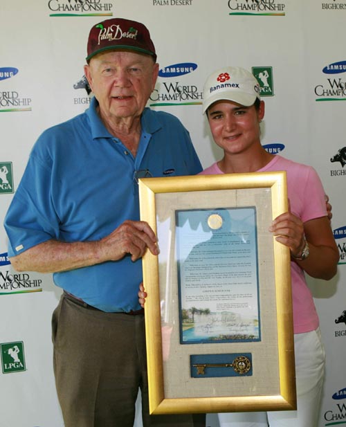 '신 골프 여제' 로레나 오초아(멕시코)가 삼성월드챔피언십의 날 행사에 참석했다. 올해 브리티시오픈, 캐나다오픈에 이어 세이프웨이 클래식까지 연속 3승을 보태며 상금, 다승, 평균 타수 등 전 부문에서 선두를 질주하고 있는 로레나 오초아가 29일(한국시난) 미국 캘리포니아 팜데저트를 방문, ‘삼성월드챔피언십의 날'에 참석해 행사를 빛냈다. 오초아는 이날 이 지역 팜데저트 아카데미서 열린 ‘삼성월드챔피언십의 날’행사에 참석해 딕 켈리 시장으로부터 명예시민증을 받았다. 특히 이날 팜데저트 시는 삼성월드챔피언십 대회 기간인 오는 10월 8일부터 14일까지를 '삼성월드챔피언십의 주'로 선정했다고 발표하기도 했다. 전년도 우승자인 오초아는 '별들의 전쟁'으로 불리는 삼성월드챔피언십의 4가지 출전 자격을 따냈고 이번 대회까지 포함하면 삼성월드챔피언십에 연속 5회 출전하게 되는 단골 손님. 켈리 시장은 “오초아가 3개 대회서 연속 우승하며 단일 시즌 상금 300만 달러를 눈 앞에 두고 있는 것을 알고 있다”며 "세계 최고 수준의 삼성월드챔피언십에 걸맞는 최고의 실력으로 대회와 지역을 더욱 빛내 줄 것을 기대한다”고 말했다. 이번 방문에서 오초아는 팜데저트시 명예시민증을 수여 받은 후 팜데저트 골프아카데미에서 클리닉을 열어 주니어 골퍼들에게 강습을 실시했다. 또한 지역 YMCA 및 유나이티드 웨이(United Way) 등의 자선단체를 위한 100만 달러 모금을 목표로 파3홀에서 홀인원 스윙에 나서기도 했는데 파3홀 165야드에서 아깝게 기회를 놓쳤다. 이번 방문에서 오초아는 “먼저 이런 특별한 행사에 초청해준 삼성에 감사 드린다” 며 “이번 대회에서도 꼭 우승 트로피를 지킬 수 있도록 최선을 다하겠다”고 참석소감을 밝혔다. 한편 팜데저트에 위치한 빅혼골프클럽 역시 삼성월드챔피언십 개최 준비에 박차를 가하고 있는 것으로 알려졌다. 지난 2004년 24회 대회부터 내리 4년간 삼성월드챔피언십을 유치한 빅혼골프클럽의 R.D.허버드 대표는 "삼성월드챔피언십 대회 기간은 빅혼골프클럽 연간 행사 중 하이라이트" 라며 "이번 삼성월드챔피언십 4년 연속 개최는 세계 최정상급 선수들이 우리 캐년코스의 우수성과 도전을 인정하는 증거"라고 말했다. 72홀의 스트로크 플레이 방식으로 진행되는 삼성월드챔피언십은 지난 26년간 5개 대륙에서 개최되어 왔으며, 27회를 맞이하는 올해는 대회사상 최고의 상금인 100만 달러를 놓고 20명의 세계 최정상급 선수들이 격돌하게 된다. sun@osen.co.kr 팜데저트에서 열린 삼성월드챔피언십의 날 행사에 참석한 오초아가 딕 켈리 시장으로부터 명예시민증을 받고 있다.