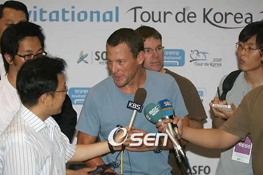 고환암을 이겨내 투르트프랑스 사이클대회 7연패를 달성하고 은퇴한 랜스 암스트롱이 현대캐피탈 2007 투르 드 코리아에 참가하기 위해 30일 한국을 방문했다. 암스트롱은 난치병 환우들과 만남의 시간을 가지고 사이클 동호회 회원들과 올림픽공원에서 시범경기를 가진다. 암스트롱이 밝은 표정으로 취재진과 인터뷰를 하고 있다./인천공항=손용호 기자spjj@osen.co.kr
