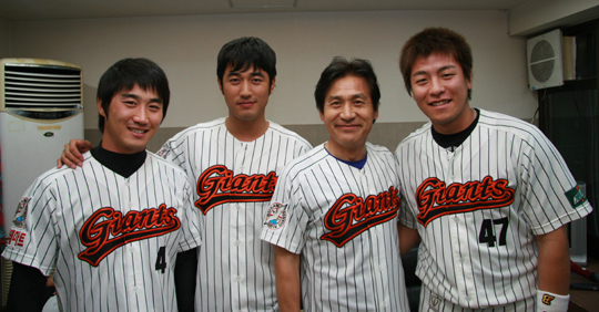 잘 생긴 외모로 여성팬들에게 큰 인기를 끌고 있는 롯데 내야수 정보명(27)의 별명은 영화배우 조한선. 이유인 즉 조한선과 닮았기 때문. '자의반 타의반'이라는 것이 구단 관계자의 귀띔. 정보명이 31일 두산전을 앞두고 사직구장내 귀빈실에서 조한선을 만났다. 이날 조한선은 안성기와 함께 내년 1월 개봉 예정인 '마이 뉴 파트너' 촬영차 야구장을 찾은 것. 처음 만난 두 사람은 서로 할 말을 잃어 버렸다. 침묵의 시간이 흐른 뒤 정보명과 조한선은 '인물이 출중하다'며 서로를 치켜 세웠다. '마이 뉴 파트너'에서 열혈 형사 역을 맡은 안성기의 극중 이름은 강민호. 우연하게도 롯데 주전 포수 강민호와 이름이 똑같다. 강민호를 만난 안성기는 "궂은 일을 도맡아 하는 포수의 역할과 자신의 극중 배역이 비슷하다"며 "실제로 보니 너무 멋있다"고 칭찬했다. 구단 사무실 앞에서 우연히 마주친 이대호와 조한선은 '예전부터 팬이었다'며 반갑게 악수를 나눴다. 이대호는 조한선에게 "경기 후 자신이 쓰던 방망이에 사인해 주겠다"고 약속하자 조한선은 기대에 부풀어 있다는 후문. what@osen.co.kr 정보명-조한선-안성기-강민호 / 롯데 자이언츠 제공.
