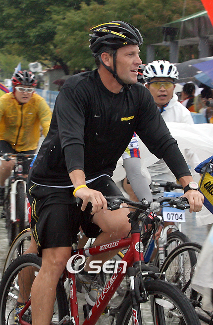 고환암을 극복하고 도로일주 사이클 대회 '투르 드 프랑스' 7연패에 빛나는 사이클 황제 랜스 암스트롱이 1일 오후 서울 올림픽공원에서 진행된 '현대캐피탈 인비테이셔널 투르드 코리아 2007'에 참석해 자전거 동호인과 소암암 환자 가족 등 약 1000여 명이 참석한 가운데 희망 레이스를 펼쳤다. 랜스 암스트롱이 동호인들과 함께 결승 지점을 통과하고 있다./김영민 기자ajyoung@osen.co.kr