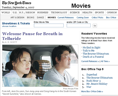이창동 감독의 '밀양'이 미국의 유력일간지 '뉴욕 타임스' 4일자(한국시간) 인터넷판 영화면 톱사진으로 소개돼 눈길을 끌고 있다. '뉴욕 타임스'는 이날 텔루라이드 영화제 관련기사를 영화면 톱으로 올리면서 전도연과 송강호가 택시에 나란히 앉아있는 '밀양'의 스틸 사진을 게재했다. 올해 칸국제영화제 여우주연상을 수상한 '밀양'은 콜로라도주에서 개막하는 34회 미국 텔루라이드 영화제에 초청을 받아 참가중이다. A.O. 스코트 기자는 기사에서 '전도연이 어린 아들과 낯선 도시로 이주한 한 미망인의 가슴속 내면 연기를 훌륭하게 해냈다'고 칭찬을 아끼지 않았다. 이번 영화제에는 루마니아의 '4달, 3주 그리고 2일'과 줄리앙 슈나벨의 '잠수종과 나비' 등 칸에서 호평받은 다수의 작품들이 출품됐다. 텔루라이드 영화제는 미국 영화 관계자와 비평가들의 주최로 해마다 열리며 아카데미와 달리 비경쟁 성격을 갖고 있다. mcgwire@osen.co.kr '뉴욕 타임스' 인터넷판 캡처
