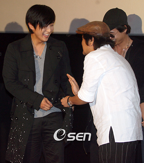 인기리에 방송됐던 MBC 수목 드라마 '개와 늑대의 시간'의 종방연이 주연배우 최재성 이준기 정경호 남상미 등이 참석한 가운데 6일 용산 CGV에서 열렸다. 출연배우들은 팬들과 함께 마지막 회를 영화관 스크린으로 감상하며 종방의 아쉬움을 달랬다. 이준기가 먼지가 묻은 것 같은 코트를 입고 나타나자 성지루가 먼지를 터는 시늉을 하고 있다. /손용호 기자spjj@osen.co.kr