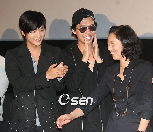 인기리에 방송됐던 MBC 수목 드라마 '개와 늑대의 시간'의 종방연이 주연배우 최재성 이준기 정경호 남상미 등이 참석한 가운데 6일 용산 CGV에서 열렸다. 출연배우들은 팬들과 함께 마지막 회를 영화관 스크린으로 감상하며 종방의 아쉬움을 달랬다. 드라마에서 국정원 팀장으로 나오는 정경순의 인사말 차례가 되자 이준기와 정경호가 박수를 치고 있다./손용호 기자spjj@osen.co.kr