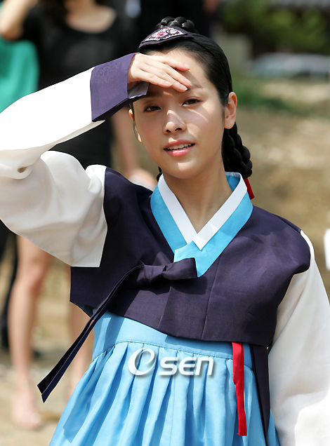 MBC 창사 46주년 특별기획 드라마 '이산' 제작보고회가 7일 용인시 MBC 문화동산 오픈세트장에서 열렸다. '이산'은 18세기 후반 파란만장하고 굴곡진 인생을 살았던 조선조 제22대 임금 정조(正祖) 이산(李蒜)의 극적인 인생 속 기다림과 좌절, 빛나는 업적과 안타까운 사랑을 담은 드라마다. 한지민이 태양이 뜨거운 듯 손으로 빛을 가리고 있다. /황세준 기자 storjoon@osen.co.kr