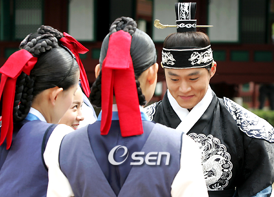 MBC 창사 46주년 특별기획 드라마 '이산' 제작보고회가 7일 용인시 MBC 문화동산 오픈세트장에서 열렸다. '이산'은 18세기 후반 파란만장하고 굴곡진 인생을 살았던 조선조 제22대 임금 정조(正祖) 이산(李蒜)의 극적인 인생 속 기다림과 좌절, 빛나는 업적과 안타까운 사랑을 담은 드라마다. 한지민이 테이프 커팅식에 늦은 이서진에게 곁눈질을 하고 있다. /황세준 기자 storjoon@osen.co.kr