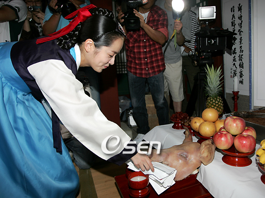MBC 창사 46주년 특별기획 드라마 '이산' 제작보고회가 7일 용인시 MBC 문화동산 오픈세트장에서 열렸다. '이산'은 18세기 후반 파란만장하고 굴곡진 인생을 살았던 조선조 제22대 임금 정조(正祖) 이산(李蒜)의 극적인 인생 속 기다림과 좌절, 빛나는 업적과 안타까운 사랑을 담은 드라마다. 한지민이 드라마 성공 기원을 위한 고사를 지내고 있다. /황세준 기자 storjoon@osen.co.kr