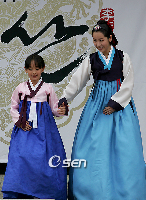 MBC 창사 46주년 특별기획 드라마 '이산' 제작보고회가 7일 용인시 MBC 문화동산 오픈세트장에서 열렸다. '이산'은 18세기 후반 파란만장하고 굴곡진 인생을 살았던 조선조 제22대 임금 정조(正祖) 이산(李蒜)의 극적인 인생 속 기다림과 좌절, 빛나는 업적과 안타까운 사랑을 담은 드라마다. 한지민과 한지민 아역을 맡은 이한나가 무대인사를 위해 손을 잡고 단상에 내려오고 있다. /황세준 기자 storjoon@osen.co.kr