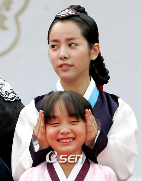 MBC 창사 46주년 특별기획 드라마 '이산' 제작보고회가 7일 용인시 MBC 문화동산 오픈세트장에서 열렸다. '이산'은 18세기 후반 파란만장하고 굴곡진 인생을 살았던 조선조 제22대 임금 정조(正祖) 이산(李蒜)의 극적인 인생 속 기다림과 좌절, 빛나는 업적과 안타까운 사랑을 담은 드라마다. 한지민이 자신의 아역을 맡은 이한나의 귀를 손으로 가리고 있다. /황세준 기자 storjoon@osen.co.kr