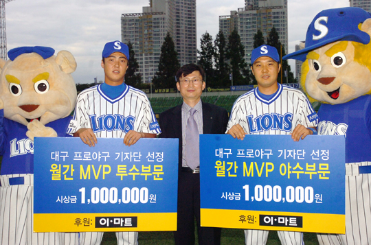 삼성 라이온즈 우완 안지만(24, 투수)과 박진만(30, 내야수)이 8월 한 달간 가장 두드러진 활약을 펼친 선수로 선정돼 상금 100만 원씩 받았다. 안지만과 박진만은 이마트가 후원하고 대구 프로야구 기자단이 선정한 삼성 '8월 우수투수-타자상'을 7일 대구 현대전에 앞서 수상했다. 안지만은 8월 한 달간 10경기에 등판해 1승(16⅓이닝 12피안타 6볼넷 10탈삼진 3실점)에 방어율 1.65로 안정된 투구를 펼쳤다. 박진만은 19경기에 출장, 타율 3할4푼5리(58타수 20안타) 13타점 6득점 1도루로 맹타를 휘둘렀다. what@osen.co.kr 7일 대구 현대-삼성전에 앞서 강종식 이마트 칠성점장이 삼성 안지만과 박진만에게 대구기자단 선정 8월 MVP 시상을 하고 있다. / 삼성 라이온즈 제공.