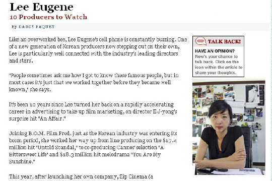 영화사 집의 이유진 대표가 세계적인 영화전문지 버라이어티가 발표한 ‘주목할 만한 10인의 프로듀서’로 선정됐다. 이유진 대표는 ‘스캔들-조선남여상열지사’ ‘달콤한 인생’ ‘너는 내 운명’ ‘그놈 목소리’ 등 굵직한 흥행작들을 제작해 온 충무로의 대표적인 실력파 프로듀서다. 올해 초에는 한국인 프로듀서 최초로 스티븐 스필버그, 올리버 스톤, 톰 크루즈 등 할리우드의 내로라 하는 감독과 배우들이 소속된 에이전시 CAA와 전속계약을 체결하는 등 해외 시장에서도 크게 주목받고 있다. 특히 영화 ‘행복’의 공동 제작자로 제32회 토론토 국제영화제 참석한 이유진 대표는 7일 세계 유력 영화인 300명이 모인 ‘Variety's 10 Producers To Watch’ 파티에서 스포트라이트를 받았다. 이유진 대표는 현재 프랑스 스튜디오 카날과 김지운 감독의 프렌치 누아르 리메이크 프로젝트를 진행중이며, 할리우드의 시나리오를 검토하며 해외 진출을 본격화하고 있다. pharos@osen.co.kr