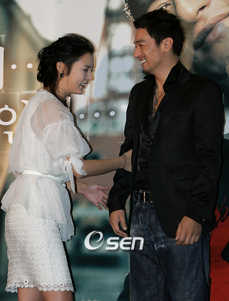 버릴수도 가질수도 없는 사랑에 올인하는 한 남자의 뜨거운 삶을 그린 영화 '사랑' 언론시사 및 기자 간담회가 곽경택 감독, 주연배우 주진모 박시연 김민준이 참석한 가운데 11일 오후 서울 종로구 서울극장에서 열렸다. 다정하게 포즈를 취해달라는 취재진의 요청에 주진모가 어깨동무를 하자 박시연이 조금 어색한 듯 팔짱으로 대신하고 있다. /황세준 기자 storkjoon@osen.co.kr