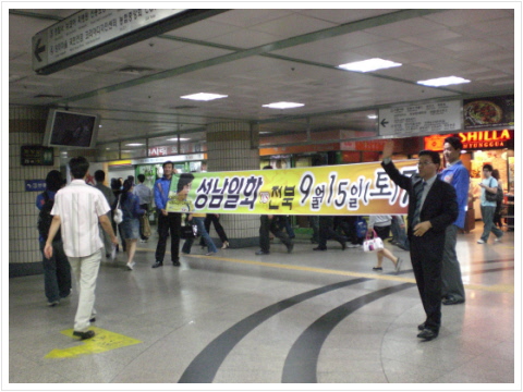 선두를 탈환하고자 하는 마음은 선수단과 구단도 같은 마음이다. 후반기 들어 첫 1위 자리를 내준 성남 일화는 오는 15일 전북 현대와의 홈경기를 앞두고 승리 기원 홍보활동을 펼쳤다. 구단 전 직원이 유동인구가 많은 곳에 직접 나간 이번 홍보 활동은 출근길 시민들에게 전북과의 경기를 알리는 계기가 됐다. 특히 두 팀은 19일과 26일 벌어지는 아시아축구연맹(AFC) 챔피언스리그 8강전을 통과할 경우 4강전서 만나게 돼 있어 이날 경기가 ‘미리보는 AFC 4강전’으로 팬들의 관심이 집중된다. 한편 성남은 전반기에도 구단 직원들이 말가면을 직접 쓰고 가두 홍보활동을 하고 UCC도 제작해여 온라인 홍보를 펼친 바 있다. 7rhdwn@osen.co.kr 성남 일화 제공.