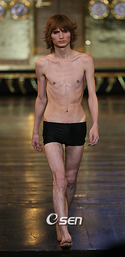 '2007 엘리트 모델 선발대회' 한국 본선이 14일 오후 서울 광장동 워커힐호텔 가야금홀에서 막을 올렸다. 1971년 프랑스 파리에서 시작된 이 대회는 해마다 전세계 60여 개국에서 수많은 모델들이 참가하는 미의 경연장으로 이번 한국 본선 선출자들은 10월 아시아 태평양 지역대회에 대표로 참가하게 된다. 상체가 무척 마른듯한 한 남성 모델이 수영복 심사에서 워킹을 선보이고 있다./김영민 기자ajyoung@osen.co.kr