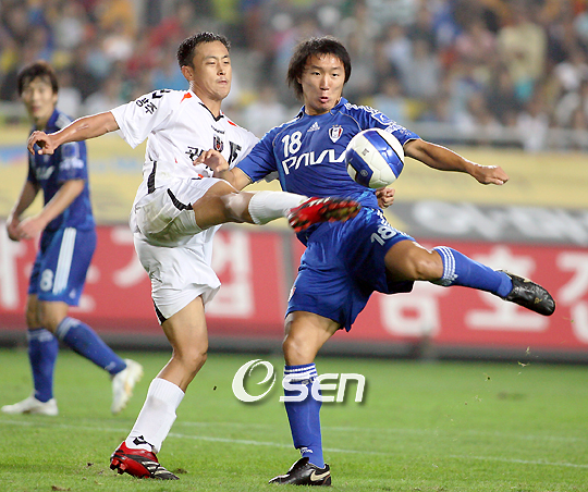 삼성 하우젠K-리그 수원 삼성과 광주 상무의 경기가 15일 수원 월드컵구장에서 벌어졌다. 관중석 난입 파동으로 심적 고통을 겪고 있는 안정환이 선발 출장한 가운데 수원은 0-0으로 비겨 7연승에 실패했다. 후반 교체 멤버로 들어온 신영록이 가슴으로 볼을 트래핑한 뒤 슛을 노렸지만 광주 마철준이 먼저 공을 걷어내고 있다./수원=손용호 기자 spjj@osen.co.kr