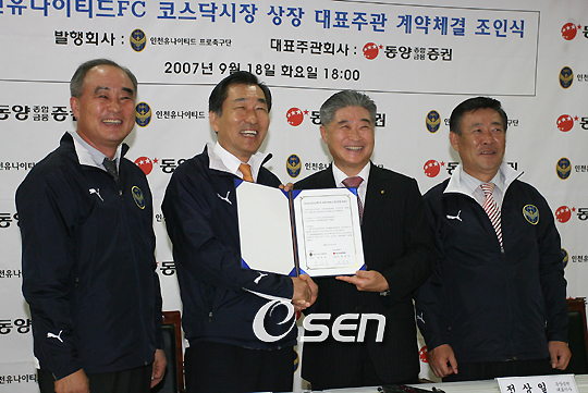 인천 유나이티드가 아시아 축구 클럽 최초로 코스닥 입성을 위한 첫 발을 내딛었다. 인천은 18일 인천 문학 월드컵 경기장에서 코스닥 시장 상장을 위한 대표 주관사로 동양종합금융증권을 선정하고 계약 체결 조인식을 가졌다. 이 자리에는 인천 구단주인 안상수 인천 시장과 전상일 동양종합금융증권 대표이사 등이 참석했다. 안상수 구단주는 "2003년 창단 이후 2005년 리그 통합 우승, 2006년 흑자 경영 달성 등 많은 발전을 이루었다" 며 "코스닥 상장은 창단할 때 시민들에게 약속했던 것이다. 2009년 하반기에 코스닥 상장을 위해 많은 비즈니스 모델을 만들도록 하겠다" 며 말했다. 안종복 인천 대표이사 역시 "주식 상장에 있어서 가장 문제가 되었던 부분이 장기적인 수익원의 확보였다" 며 "숭의 전용구장이 개장하고 여러 가지 스폰서들과 장기계약을 맺음으로써 장기적인 흑자 경영의 가능성을 내비쳤다" 며 상장이 희망적일 것이라고 밝혔다. 전상일 동양증권 대표이사는 "외형적인 부분과 여러 가지 요건을 갖추기 위해서 노력하고 있다" 며 "사견으로는 상장이 99% 될 것이라고 생각한다" 고 말했다. bbadagun@osen.co.kr 안상수 구단주와 전상일 동양종합금융증권 대표이사가 조인서를 교환 악수를 나누고 있다./인천=손용호 기자spjj@osen.co.kr