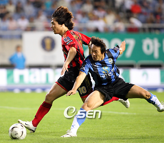 박주영(22, FC 서울)이 그라운드로 돌아왔다. 박주영은 18일 인천 문학월드컵경기장서 벌어진 2007 하나은행 FA컵 8강전에 예상을 깨고 선발 출전, 78분을 뛰었다. 지난 5월 25일 성남전 이후 약 4개월 만에 공식 경기 출전으로 박주영은 그동안 왼발 등뼈 부상으로 재활훈련에 열중하며 복귀 시기만을 기다리고 있었다. 원톱으로 출격한 박주영은 이날 경기에서 이렇다 할 모습을 보여주지는 못했다. 인천의 김학철과 임중용이 노련하게 마크, 쉽사리 득점 찬스를 잡지 못했다. 이에 세뇰 귀네슈 서울 감독은 후반 들어 정조국을 투입, 박주영과 투톱으로 활용했다. 하지만 아직 경기 감각이 완전하지 못한 박주영은 결국 후반 33분 김한윤과 교체돼 나왔다. 7rhdwn@osen.co.kr 전반 박주영이 인천 김학철의 마르클 받으며 슛을 시도하고 있다./인천=손용호 기자spjj@osen.co.kr