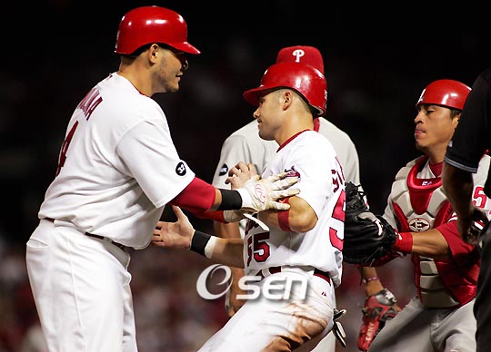 20일(한국시간) 세인트루이스의 부시 스타디움에서 벌어진 세인트 루이스 카디널스와 필라델피아 필리스의 경기 카디널스의 4회말 1사 1,2루서 애덤 웨인라이트의 우익선상 안타 때 1루주자 야디에 몰리나(왼쪽)가 2, 3루간에서 런다운에 걸리자 홈으로 향했던 2루주자 스킵 슈메이커(가운데)가 다시 런다운에 걸려 3루로 돌아오다 포수 크리스 코스테에게 태그아웃되고 있다./부시스타디움(세인트루이스)=주지영 특파원 jj0jj0@osen.co.kr