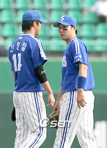 2007 삼성PAVV 프로야구 두산 베어스와 SK 와이번스와 삼성 라이온즈의 경기가 23일 인천 문학 야구장에서 벌어졌다. SK의 5회말 2사 1,3루서 도루를 시도한 1루주자 이진영이 런다운에 걸린 사이 3루주자 조동화의 홈인을 막지 못해 더블스틸을 허용한 삼성 2루수 신명철(왼쪽)과 유격수 박진만이 아쉬워하고 있다./인천=김영민 기자ajyoung@osen.co.kr