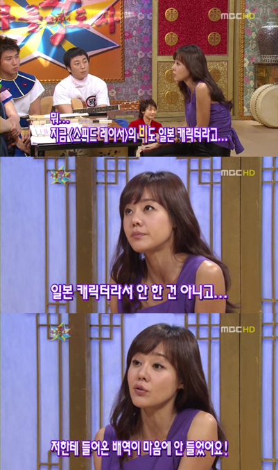MBC ‘황금어장’의 ‘무릎팍도사’에 출연한 김윤진이 비 팬들에게 원성을 사고 있다. 비가 할리우드 영화 ‘스피드 레이서’에서 일본인 역으로 출연하고 있다고 언급한 부분이 논란의 여지가 된 것. 26일 방송된 ‘무릎팍도사’에는 배우 김윤진이 출연해 힘들었던 이민시절과 미국 드라마 ‘로스트’에 출연하기까지의 과정 등을 진솔하게 풀어내 좋은 반응을 얻었다. 하지만 논란은 예기치 못한 곳에서 터져 나왔다. 김윤진이 스티븐 스필버그의 영화 ‘게이샤의 추억’ 주연 역을 거절했던 이유를 밝히며 잠깐 거론했던 가수 겸 배우 비 관련 발언이 비 팬들의 심기를 불편하게 한 것. 김윤진은 ‘게이샤의 추억’의 일본인 주연 역 제의를 거절한 이유에 대해 “동양을 배경으로 동양배우들이 주인공으로 나오는 영화는 할리우드에서 거의 10년에 한 번 제작될까 말까한 작품이기 때문에 욕심이 났다”며 “지금 비가 (영화 ‘스피드 레이서’에서) 하고 있는 역도 일본인 캐릭터라고 알고 있는데 그 것(일본인 역) 때문에 안한 것은 아니고 들어온 역이 마음에 들지 않았다”고 언급했다. 그녀는 “악역이었는데 만약 들어온 역이 마음에 들었다면 했을 것이다. 그러나 중국의 톱스타인 장쯔이는 사람 같은 좋은 캐릭터인 반면 난 톱스타는 아니었지만 한국에서 주연배우를 맡은 내가 그 밑에 들어갈 이유는 없다고 생각했다”고 당당히 밝혔다. 그런데 여기서 문제가 된 부분은 비가 영화 ‘스피드 레이서’에서 맡은 역이 일본인 역이 아니라는데 있었다. 영화 자체가 일본 만화 ‘마하 고고’를 원작으로 한 작품이기는 하지만 비가 극중에서 맡은 캐릭터는 사실 국적이 뚜렷하게 정해져 있는 것이 아닌 그냥 동양인 카레이서라고 명시돼 있는 것. 비가 맡은 배역 이름인 태조 토고칸이 공개됐을 당시에도 일부 네티즌들로부터 ‘일본 이름같다’는 논란이 일기도 했지만 태조라는 이름 자체가 조선을 건국한 이성계를 뜻하는 의미이며 칸 역시 동양의 왕을 가리키는 용어라는 사실이 일부 언론을 통해 밝혀지면서 잠잠해진 바 있다. 방송이 끝난 후 시청자들은 홈페이지 게시판을 통해 “김윤진 씨의 비의 발언을 정정해야하는 이유는 이번 한번으로 끝나는 것이 아니라 유독 재방송이 많은 ‘무릎팍도사’가 매번 방송될 때마다 시청자들에게 잘못된 정보를 전하게 되는 것 때문입니다. 물론 그냥 지나칠 수도 있지만 잘못된 정보를 계속해서 시청자들에게 전할 수는 없기에 정정을 요청합니다”, “할리우드 영화 ‘스피드레이서’에서 비가 연기하는 태조 역은 일본인캐릭터가 아닙니다. 일본 원작이기는 하지만 출연인물은 다 새롭게 각색된 걸로 압니다. 윤진씨의 잘못을 따지기 전에 MBC에도 문제가 있다고 봅니다. 잘못된 정보를 걸러서 편집해야 될 책임이 있다고 봅니다”라며 목소리를 높였다. 하지만 이와 별개로 “한국인으로서 너무 힘이 되고 용기가 되는 말들을 하시네요. 김윤진 씨는 보기만 해도 기분이 좋습니다”, "할리우드에서 성공했다는 것만 알고 있었는데 오늘 방송을 보니 당신의 생각 자체가 멋집니다. 앞으로도 좋은 연기 보여주세요. 당신이 진정한 월드스타입니다”라며 프로그램 내내 솔직한 면모를 드러낸 김윤진을 칭찬하는 의견도 다수 눈에 띄었다. 한편 이날 ‘황금어장’은 ‘무릎팍도사’와 ‘라디오스타’의 맞대결로 관심을 모았으며 ‘라디오스타’에는 영화배우 봉태규가 등장해 웃음을 선사했다. hellow0827@osen.co.kr