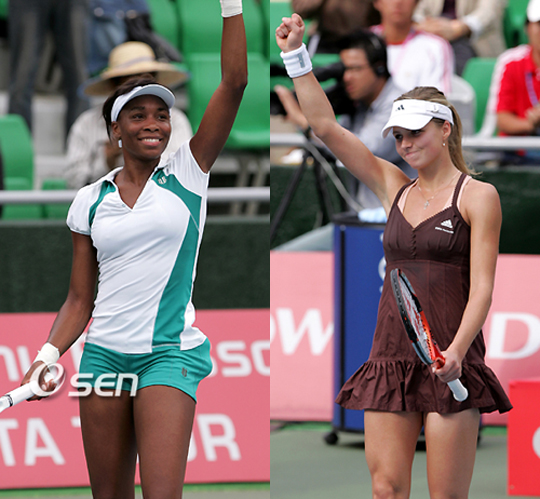 [OSEN=올림픽공원, 우충원기자] '흑진주냐, 제2의 샤라포바냐'. '흑진주' 비너스 윌리엄스(27)는 29일 오후 서울 송파구 방이동 올림픽공원 테니스 코트에서 열린 국내 유일의 WTA(여자프로테니스)투어 대회인 한솔코리아 오픈 여자단식 4강전에서 플라비아 페네타(25)를 2-0(6-2 6-2)로 꺾고 결승에 진출했다. 또, 이어 벌어진 4강 두번째 경기서는 마리아 키릴렌코(19)가 지난해 우승자인 엘레니 다닐리두(25)에 2-0(7-5 6-2)로 승리를 거두고 결승행 티켓을 거머쥐었다. 윌리엄스와 키릴렌코의 결승전은 오는 30일 올림픽공원 테니스 코트에서 열릴 예정이다. 4강 첫 경기서 윌리엄스는 결승전을 대비한 연습경기를 치르듯 손쉽게 페레나에 승리를 거두고 결승에 선착했었다. 이어 벌어진 키릴렌코의 경기서는 첫 세트서 접전이 펼쳐졌다. 1세트 중반 5-5로 팽팽한 경기를 펼치던 양 선수는 다닐리두의 실책에 힘입어 6-5로 앞섰다. 그러나 키릴렌코는 1세트 최종 게임서 40-0으로 뒤지며 어려운 경기를 펼쳤다. 하지만 상대 실책과 날카로운 스트로크를 묶어 경기를 뒤집었고 1세트를 7-5로 따냈다. 이후 키릴렌코는 기분좋게 다닐리두를 압박하기 시작했고 결국 2세트서 6-0 완승을 거두며 결승전에 진출했다. 한편 이번 대회 우승자는 상금 2만 1140달러와 투어 포인트 115점을 받는다. 윌리엄스는 이번 대회와 오는 10월 8일 태국 방콕에서 열리는 PTT 방콕오픈에서 우승하면 11월 스페인 마드리드에서 열리는 왕중왕전 소니 에릭손 챔피언십에 출전할 수 있다. 10bird@osen.co.kr 비너스 윌리엄스-마리아 키릴렌코.