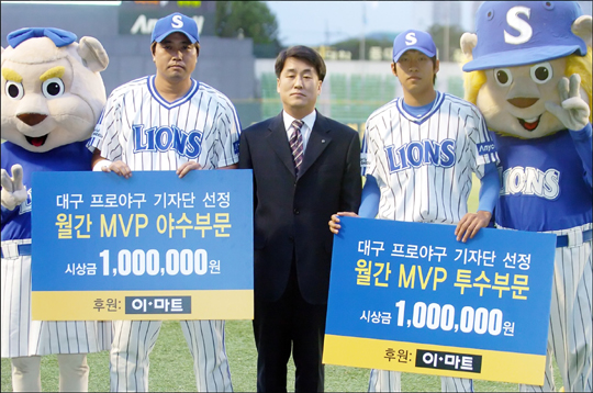 삼성 라이온즈 윤성환(26, 투수)과 양준혁(38, 외야수)이 9월 한 달간 가장 빛나는 활약을 펼친 선수로 선정돼 상금 100만 원씩 받았다. 윤성환과 양준혁은 이마트가 후원하고 대구 프로야구 기자단이 선정한 삼성 '9월의 우수 투수-타자상'을 1일 대구 KIA전에 앞서 수상했다. 윤성환은 9월 한 달간 9경기에 등판해 14이닝 5피안타 6 4사구 12탈삼진 1실점에 방어율 0.64로 호투했고 양준혁은 14경기에 출장, 타율 4할1푼4리(58타수 24안타) 4타점 7득점으로 맹타를 휘둘렀다. what@osen.co.kr 1일 대구 KIA전에 앞서 김건오 이마트 경산점장이 삼성 양준혁과 윤성환에게 대구 기자단 선정 9월 MVP 시상 후 기념 촬영을 가졌다. / 삼성 라이온즈 제공.