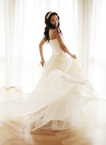 오는 10월 19일 오후 6시 서울 광장동 쉐라톤워커힐 애스톤하우스에서 3살 연상의 사업가 박주영 씨와 결혼식을 올리는 김희선이 지난 달 30일 치른 약혼식에서 입었던 드레스 사진을 공개했다. 김희선은 9월 30일 쉐라톤워커힐 호텔에서 양가 가족과 친척 몇몇만 초대한 가운데 약혼식을 올렸다. 약혼식 드레스를 입고 포즈를 취해보는 김희선의 표정에는 행복이 가득하다. /인하우스엔터테인먼트 제공.