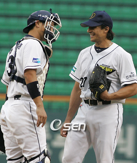 2007 삼성PAVV 프로야구 두산 베어스와 현대 유니콘스의 경기가 3일 잠실 야구장에서 벌어졌다. 두산의 리오스가 9회 1사까지 퍼펙트를 기록했으나 현대 강귀태의 안타로 기록이 깨지자 포수 채상병이 마운드에 올라 미소지으며 함께 아쉬움을 달래고 있다. 두산이 3-2로 승리, 리오스는 22승을 달성했다. /잠실=황세준 기자 storkjoon@osen