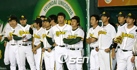 한국시리즈 4회 우승에 빛나는 현대 유니콘스가 고별전을 승리로 장식, 유종의 미를 거두고 12년간의 역사를 뒤로 한 채 간판을 내렸다. 현대는 5일 수원구장에서 열린 한화전서 2-0으로 승리하며 마지막 경기를 승리했다. 한화전을 끝으로 구단이 사라지는 운명을 맞은 현대는 이날 경기서 최선을 다한 끝에 승리, 롯데를 제치고 시즌 6위로 마지막 자존심을 지켰다. 이날은 경기에 임하는 자세에서 승부가 갈렸다. 고별전을 승리로 장식할 각오인 현대는 주전 선수들을 모두 출전시키며 승리에 강한 집착을 보였다. 반면 한화는 4일 날 두산전 승리로 3위가 확정됨에 따라 준플레이오프를 대비하기 위해 고동진, 신경현, 김민재 등 주전을 선발 라인업에서 빼고 경기에 임했다. 그 결과는 2회말 현대 공격때부터 나타났다. 2회말 선두타자 브룸바의 좌측 안타, 정성훈의 볼넷과 한화 투수 유원상의 연이은 폭투로 인해 브룸바가 홈을 밟아 1-0으로 앞서 나갔다. 3회말에도 현대는 선두타자 전준호가 볼넷으로 걸어 나간데 이어 황재균이 중전안타를 치며 무사 1,3루를 만들었다. 이어 이택근이 유격수 앞 땅볼을 친 사이 전준호가 득점, 2-0을 만들었다. 한화 신예 선발 유원상은 5이닝 2실점으로 비교적 호투했으나 승리를 향한 강한 집념을 보인 현대를 막아내지 못했다. 1998년 현대 첫 우승의 주역으로 신인왕에 올랐던 선발 김수경은 5이닝 무실점으로 호투, 시즌 12승과 함께 고별전 승리의 주인공이 됐다. 황두성이 마무리로 올라와 경기를 매조지, 시즌 첫 세이브를 기록했다. 이날은 현대의 고별전을 보기 위해 평소보다 2배 이상 많은 현대 팬들이 운동장을 찾았다. 한화팬이 많지 않은 상황에서 1,444명의 관중이 경기장을 찾아 현대의 고별전을 지켜봤다. 팬들은 특히 타석에 들어서는 선수들 한명 한명의 이름을 큰 소리로 연호하며 열렬히 응원했으며 1루까지 전력 질주하는 김일경에게 큰 박수를 보내기도 했다. 또 수비를 마치고 들어오는 현대 선수들에게 팬들은 뜨거운 함성을 보내며 힘을 불어 넣어주었다. 현대 구단은 이날 운동장을 찾은 팬 전원을 경기 후 그라운드로 내려오게해 선수들과 기념사진을 찍도록 배려하며 성원에 보답했다. 7rhdwn@osen.co.kr 고별전을 착잡한 심정으로 치르는 현대 유니콘스 선수들. /현대 유니콘스 제공