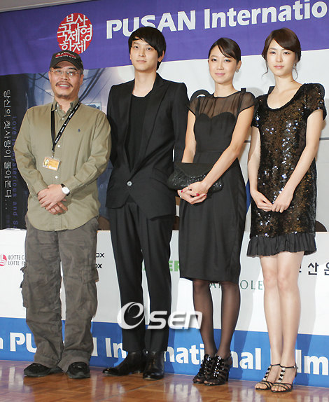 부산국제영화제 개막 3일째인 6일 부산 해운대 파라다이스 호텔서 열린 영화 'M'의 기자회견장은 취재진 규모를 수용하기엔 턱없이 협소한 장소로 인해 회견 자체가 정상적으로 진행되지 못하는 사태가 벌어졌다. 장내 질서를 무시하고 행사를 강행하려는 주최측의 방침에 취재진의 항의가 거세 행사가 지연되다 결국 장내가 정리되어 이명세 감독 강동원 공효진 이연희(왼쪽부터)가 포토타임을 갖고 있다. /부산=황세준 기자 storkjoon@osen.co.kr