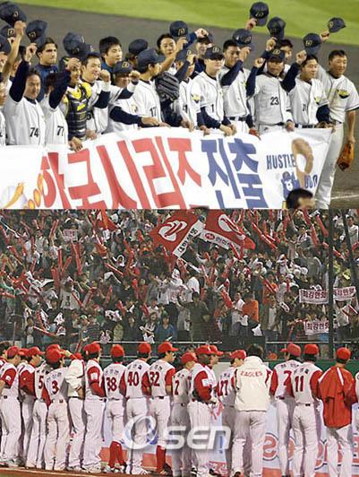 플레이오프 최대 승부처는 2차전?. 한화와 두산이 동상이몽을 꾸면서 2년 만에 플레이오프에서 다시 만났다. 당시 한화는 준플레이오프에서 SK를 3승 2패(2005년에만 5전 3선승제)로 꺾고 올라오면서 너무 힘을 쏟았는지 플레이오프에선 3연패로 떨어졌다. 이번에도 한화는 삼성을 2승 1패로 무릎꿇리기까지 막대한 전력 소모를 감수했다. 1차전 선발로 써야 할 에이스 류현진이 준플레이오프 3차전 롱 릴리프로 나섰기에 언제, 어느 시점에 등판할지조차 미지수다. 제2선발 정민철도 허리 통증이 심상찮은 듯 여겨진다. 김인식 한화 감독이 지난 14일 플레이오프 1차전 선발로 최영필을 예고한 점에서 쉽지 않은 마운드 운용이 예상된다. 마무리 구대성이나 베테랑 선발 문동환, 용병 세드릭도 확신을 주지 못하고 있는 실정이다. 그러나 현재 한화가 처한 상황은 현대와 맞붙었던 2006년 플레이오프 정국과도 흡사하다. 당시 한화는 준플레이오프에서 KIA에 2승 1패 신승을 거두고 올라와 현대마저 3승 1패로 격침시키고 한국시리즈에 진출했다. 이때 한화는 수원 원정 1차전 패배 후 3연승을 거뒀다. 김 감독은 1차전을 현대 에이스 캘러웨이에게 막혀 패배(한화 선발은 문동환)한 뒤 2차전은 예상을 뒤엎고, 류현진 대신 정민철을 올려 승리를 따냈다. 기세를 탄 한화는 대전으로 이동해 류현진-문동환-구대성을 3~4차전에 쏟아붓고 시리즈를 마감했다. 리오스 의존도가 높은 두산의 마운드 운용 전력은 공교롭게도 2006년 현대의 그것과 비슷하게 돌아갈 것이다. 다만 차이가 있다면 한화에서 2006년의 정민철과 구대성 역할을 과연 누가 재연할 수 있느냐다. 전술 운용의 객관적 우위를 확보한 김경문 두산 감독은 내심 2005년의 재판을 꿈꿀 것이다. 그래야 SK와 한국시리즈 1차전부터 리오스를 다시 쓸 수 있다. 반면 김인식 감독은 2006년의 '타짜 테크닉'을 잊지 않았을 것이다. 이길 경기와 질 경기를 확실히 나누는 김 감독의 성향상, 1차전에서 초반 주도권을 놓치면 미련을 두지 않고 2차전을 대비할 것이다. 이럴 경우 2006년처럼 2차전이 최대 승부처로 떠오르게 된다. sgoi@osen.co.kr 2005년 플레이오프에서 한화를 꺾고 팬들에게 인사하는 두산 선수단(위)과 2006년 플레이오프에서 현대를 따돌리고 한국시리즈에 진출한 뒤 한호하는 한화 선수단.