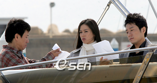 영화 '무방비 도시' 촬영현장 공개가 15일 부산 수영만 요트경기장에서 열렸다. 한국의 FBI 광역수사대 조대영(김명민 분)과 기업형 국제 소매치기 조직리더 백장미(손예진 분)의 냉혹한 한판 승부를 다룬 범죄액션 영화다. 국제 소매치기 조직을 정리한 백장미가 요트를 이용해 일본으로 도주하던 중에 쫓아온 조대영과 대치하는 장면을 촬영하고 있다. 이상기 감독 손예진 김명민(왼쪽부터)이 대본을 확인하고 있다. /부산=황세준 기자 storkjoon@osen.co.kr
