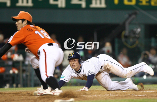 2007 프로야구 플레이오프 2차전 두산 베어스와 한화 이글스 경기가 15일 저녁 잠실구장에서 벌어졌다.두산의 3회말 1사 1,2루 2-2 동점 상황에서 최준석 삼진아웃시 한화 유원상 투수의 투구가 포수 뒤로 빠지는 사이 2루 주자 고영민 홈까지 쇄도 역전 득점을 올리며 이후 김동주까지 득점을 올렸다./잠실=김영민 기자ajyoung@osen.co.kr