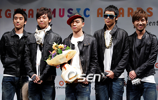 싸이월드 미니홈피 배경음악으로 한 달간 가장 많은 판매고를 올린 곡과, 두드러진 성장을 보인 신인에게 시상하는 '디지털 뮤직 어워드'가 18일 오후 서울 압구정 CGV에서 열렸다. 'Song Of The Month' 수상자로는 '거짓말'의 빅뱅이 지난 달에 이어 2회 연속 선정됐고 'Rookie Of The Month'는 '사랑을 잃고 난 노래하네'의 신인 그룹 에이트가 수상했다. 빅뱅이 수상 후 기념촬영을 갖고 있다. /황세준 기자 storkjoon@osen.co.kr