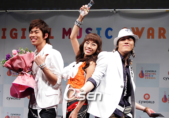 싸이월드 미니홈피 배경음악으로 한 달간 가장 많은 판매고를 올린 곡과, 두드러진 성장을 보인 신인에게 시상하는 '디지털 뮤직 어워드'가 18일 오후 서울 압구정 CGV에서 열렸다. 'Song Of The Month' 수상자로는 '거짓말'의 빅뱅이 지난 달에 이어 2회 연속 선정됐고 'Rookie Of The Month'는 '사랑을 잃고 난 노래하네'의 신인 그룹 에이트가 수상했다. 에이트가 수상 후 기념촬영을 갖고 있다. /황세준 기자 storkjoon@osen.co.kr