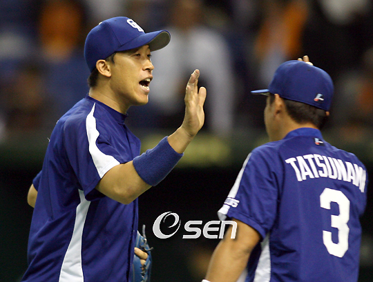 요미우리 자이언츠와 주니치 드래건스의 센트럴리그 클라이맥스시리즈 2스테이지 1차전 경기가 18일 도쿄돔에서 벌어져 주니치가 우즈의 투런홈런을 앞세워 5-2로 승리했다. 이승엽은 2안타를 치며 분전했지만 팀의 패배로 빛이 바랬다. 이병규는 1볼넷에 무안타로 부진했다. 이병규가 경기 후 타자 최고참 다쓰나미(38)와 하이파이브를 하고 있다./도쿄돔=손용호 기자spjj@osen.co.kr