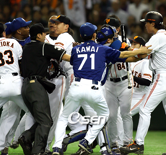 요미우리 이승엽(31)과 주니치 타이론 우즈(37)가 빈볼을 놓고 난투극 일보직전까지 가는 신경전을 벌였다. 상황은 20일 도쿄돔에서 열린 클라이맥스시리즈 3차전에서 2-3으로 요미우리가 뒤진 가운데 4회말 이승엽의 타석에서 벌어졌다. 주니치 선발 나카타 겐이치가 이승엽을 상대로 2구째 몸쪽 바짝 붙이는 직구를 뿌렸다. 깜짝 놀란 피하던 이승엽이 나카타에게 불만을 표시하자 느닷없이 주니치 1루에 서 있던 타이론 우즈가 뛰어나오면서 이승엽에게 싸움을 걸어왔다. 이승엽은 "왜~왜~"라는 말을 하면서 다가갔고 갑자기 벌어진 상황에 양팀 덕아웃에 선수들이 모두 뛰쳐나와 대치하는 장면이 연출됐다. 사태는 심판들과 양팀 감독들이 나서 말려 불상사 없이 진정됐다. 승패가 엇갈리는 극도의 예민한 상황에서 이승엽의 항의에 우즈는 거친 행동으로 맞불을 놓은 것이다. 이승엽과 우즈는 10년 가까이 한국과 일본에서 선의의 경쟁을 벌였던 두 선수 였다. 그러나 이번 2스테이지를 앞두고 우즈는 이승엽의 홈런을 폄하하는 발언으로 신경을 건들었다. 이젠 두 선수가 경기중에 난투극 일보직전까지 벌어지는 상황으로 악화됐다. sunny@osen.co.kr