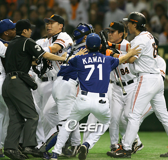 요미우리 자이언츠와 주니치 드래건스의 센트럴리그 클라이맥스시리즈 2스테이지 3차전 경기가 20일 도쿄돔에서 벌어졌다. 4회말 무사 1루서 몸쪽 바짝 붙는 볼이 들어온 뒤 이승엽이 주니치 투수 나카타에게 한 소리한 것에 1루수 우즈가 불쾌하게 반응하자 이승엽이 '네가 왜 그러냐'는 제스처를 취했고 이에 우즈가 달려나와 시비가 붙어 양팀 선수들이 뜯어말리고 있다./도쿄돔=손용호 기자spjj@osen.co.kr