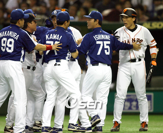 요미우리 자이언츠와 주니치 드래건스의 센트럴리그 클라이맥스시리즈 2스테이지 3차전 경기가 20일 도쿄돔에서 벌어졌다. 4회말 무사 1루서 몸쪽 바짝 붙는 볼이 들어온 뒤 이승엽이 주니치 투수 나카타에게 한 소리한 것에 1루수 우즈가 불쾌하게 반응하자 이승엽이 '네가 왜 그러냐'는 제스처를 취했고 이에 우즈가 달려나와 시비가 붙으며 코치들이 이승엽을 말리고 있다./도쿄돔=손용호 기자spjj@osen.co.kr