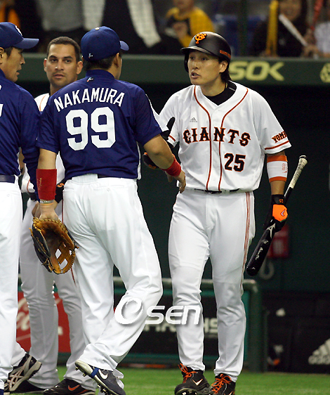 요미우리 자이언츠와 주니치 드래건스의 센트럴리그 클라이맥스시리즈 2스테이지 3차전 경기가 20일 도쿄돔에서 벌어졌다. 4회말 무사 1루서 몸쪽 바짝 붙는 볼이 들어온 뒤 이승엽이 주니치 투수 나카타에게 한 소리한 것에 1루수 우즈가 불쾌하게 반응하자 이승엽이 '네가 왜 그러냐'는 제스처를 취했고 이에 우즈가 달려나와 시비가 붙어 양 팀 선수단이 몰려나왔으나 충돌은 없었다. 주니치 나카무라가 이승엽과 얘기를 주고받고 있다./도쿄돔=손용호 기자spjj@osen.co.kr