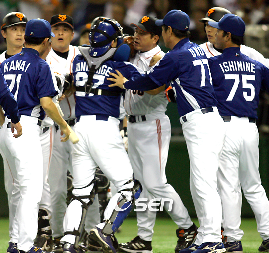 요미우리 자이언츠와 주니치 드래건스의 센트럴리그 클라이맥스시리즈 2스테이지 3차전 경기가 20일 도쿄돔에서 벌어졌다. 4회말 무사 1루서 몸쪽 바짝 붙는 볼이 들어온 뒤 이승엽이 주니치 투수 나카타에게 한 소리한 것에 1루수 우즈가 불쾌하게 반응하자 이승엽이 '네가 왜 그러냐'는 제스처를 취했고 이에 우즈가 달려나와 시비가 붙어 양 팀 선수단이 몰려나왔으나 충돌은 없었다. 화가 난 하라 요미우리 감독을 주니치 포수 다니시게가 말리고 있다./도쿄돔=손용호 기자spjj@osen.co.kr
