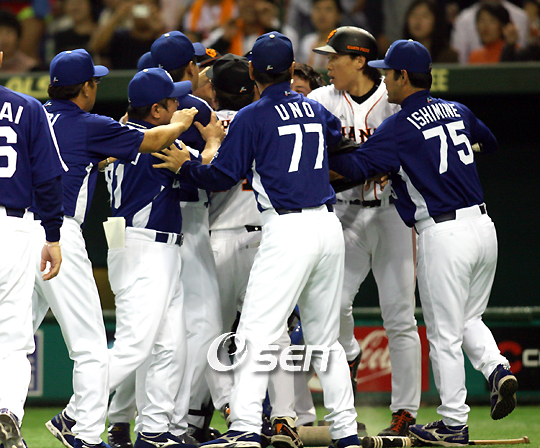 요미우리 자이언츠와 주니치 드래건스의 센트럴리그 클라이맥스시리즈 2스테이지 3차전 경기가 20일 도쿄돔에서 벌어졌다. 4회말 무사 1루서 몸쪽 바짝 붙는 볼이 들어온 뒤 이승엽이 주니치 투수 나카타에게 한 소리한 것에 1루수 우즈가 불쾌하게 반응하자 이승엽이 '네가 왜 그러냐'는 제스처를 취했고 이에 우즈가 달려나와 시비가 붙어 양 팀 선수단이 몰려나왔으나 충돌은 없었다. /도쿄돔=손용호 기자spjj@osen.co.kr