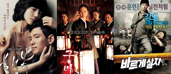 [OSNE=손남원 기자]장르가 서로 다른 한국영화 수작 세 편이 이번 휴일 극장가를 후끈후끈한 열기로 달구고 있다. 18일 개봉한 사극 스릴러 '궁녀'와 코미디 '바르게 살자', 그리고 2주연속 박스오피스 선두를 달린 멜로 '행복'이다. 올 봄과 여름 내내 할리우드 블록버스터의 공세에 시달렸던 한국영화는 7월 '화려한 휴가'와 8월 '디워'의 쌍끌이 장세후, 완전히 기력을 찾았다. 대작들로 도배됐던 여름 한 철과 달리 가을 극장가의 기류는 감독과 배우의 역량으로 승부하는 쪽이다. 10월부터는 허진호 감독의 정통 멜로 '행복'이 흥행 시장을 주도했다. 성룡의 할리우드 블록버스터 '러시아워 3'를 누르면서 기대 이상의 선전을 벌였고 개봉 3주차 150만 고지를 눈 앞에 두고 있다. '8월의 크리스마스' '봄날의 간다' 허 감독은 그동안 평단의 극찬에도 불구하고 국내 흥행에서는 늘 80만명 수준을 유지하다가 '행복'으로 돌파구를 뚫었다. '행복'의 독주에 제동을 걸고 나선 '궁녀'와 '바르게 살자'도 그 기세가 만만치 않다. '쩐의 전쟁' 박진희가 궁으로 들어간 '궁녀'는 사극, 스릴러, 호러가 결합돼 관객들에게 전혀 새로운 느낌으로 다가선다. 요즘 사극 드라마가 TV를 휩쓸고 있는 추세와 맞물려 그동안 미개척지로 남아 있던 조선시대 궁녀의 삶을 클로즈업, 관객들의 관심을 고조시키는 중이다. 장진 각본 정재영 주연의 '바르게 살자'는 장진 상표의 바른 코미디다. 장 감독의 유머에 길들여진 감독에게는 충분히 먹힐만한 웃음 코드를 다량 함유하고 있다. 최근 한국영화 코미디가 극장가 흥행권을 잃어가는 상황에서 '바르게 살자'의 성적에 충무로의 관심이 쏠리는 중이다. mcgwire@osen.co.kr