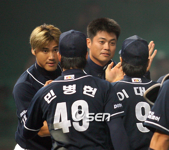 2007 프로야구 한국시리즈 2차전 SK 와이번스와 두산 베어스 경기가 23일 저녁 인천 문학야구장에서 벌어져 두산이 6회초 터진 이대수의 2타점 역전타로 SK에 6-3으로 승리를 거두며 어웨이 2연전을 모두 승리했다. 손가락 골절상을 당한 안경현이 기브스를 하고 경기장에 돌아와 이대수와 하이파이브를 나누고 있다./인천=손용호 기자spjj@osen.co.kr