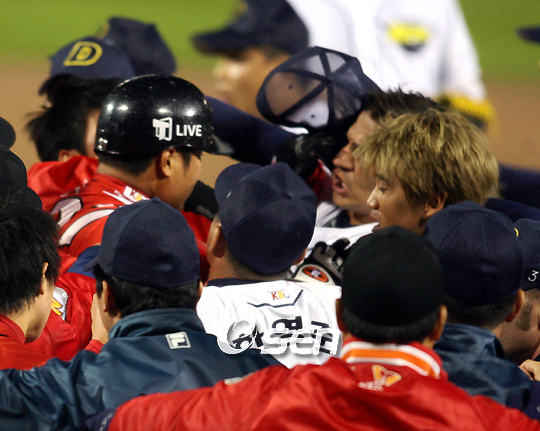 2007 프로야구 한국시리즈 3차전 SK 와이번스와 두산 베어스 경기가 25일 잠실야구장에서 벌어졌다. 6회초 1사 후 두산이 연이은 실책 등으로 7점을 내준 상태서 두산 투수 이혜천의 투구가 김재현의 다리 쪽으로 오자 빈볼 시비가 일면서 양 팀 선수들이 몸싸움을 벌였다. 가운데서 몸싸움을 벌이고 있는 이호준과 리오스를 양 팀 선수들이 말리고 있다./잠실=손용호 기자spjj@osen.co.kr
