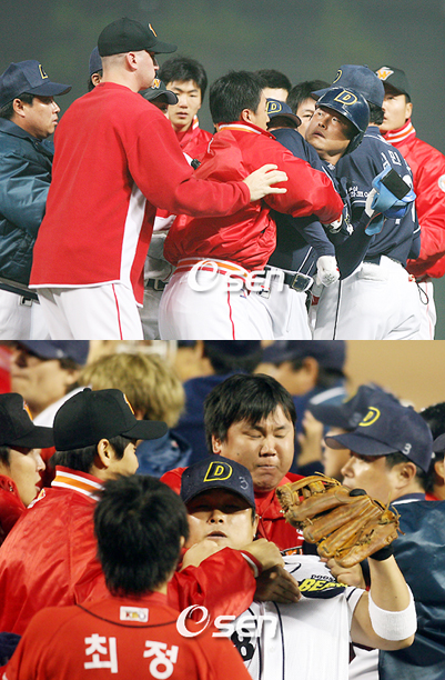 “이게 무슨 추태인가. 전국에 공중파로 생중계되는 한국시리즈에서”. 2007 프로야구 챔피언을 가리는 한국시리즈에서 빈볼 시비가 연일 벌어지고 있다. 지난 23일 인천 문학구장 2차전에서는 두산 김동주와 SK 채병룡 간 빈볼 시비로 양팀 선수단이 그라운드에서 일촉즉발의 대치상황을 연출한 데 이어 25일 잠실구장 3차전에서는 결국 한바탕 몸싸움이 벌어졌다. 이번에는 SK 김재현이 두산 이혜천의 몸쪽 공에 시비가 붙으면서 양팀 선수단이 뛰쳐나와 밀쳐대고 주먹을 날리기도 했다. 흥분한 일부 선수는 계속해서 눈살을 찌푸리게 하는 제스처를 취하기도 했다. ‘가을 축제의 장’이 과열되면서 ‘아수라장’이 돼가고 있다. 한국시리즈 우승을 향한 강한 집착과 시즌 때부터 쌓인 양팀의 묵은 감정이 폭발하고 있는 것으로 풀이된다. 두산 에이스 리오스의 투구 폼을 둘러싼 양팀 벤치간 감정싸움이 한국시리즈에서도 이어지고 1차전 때는 프런트간에 ‘몰카논란’까지 빚어지면서 양팀의 대립은 극에 달했다. 결국 이런 쌓인 감정들이 2차전과 3차전 빈볼시비로 폭발한 것이다. 두산으로서는 3차전까지 7개의 몸에 맞는 볼이 나왔고 특히 베테랑 타자들이 피해자가 되면서 더욱 흥분했다. 2차전서는 안경현이 볼에 맞아 오른 엄지 골절상을 당하기도 했다. 그 탓에 두산 선수들은 몸쪽 공에 민감한 반응을 보였다. SK로서는 ‘빈볼을 던질 상황이 전혀 아닌데 두산이 오버해 보복한다’며 맞서 3차전 몸싸움으로 이어졌다. SK도 흥분하기는 마찬가지로 그라운드를 ‘싸움판’으로 만들고 있다. SK로서는 빈볼을 던질 상황이 아니었다고 항변하지만 오해받을 만한 행위를 하지 말아야 한다. 3차전서 결국 이혜천이 퇴장을 당하는 등 상황이 최악으로 치닫자 양팀 벤치에서 ‘자제하자’는 분위기가 조성되고 있는 것은 다행이다. 김경문 두산 감독은 3차전 후 “불미스러운 모습을 보였는데 그건 더 이상 보여주면 안된다고 생각한다. 기대를 많이 했던 팬들한테 '최고의 축제' 한국시리즈서 이런 경기를 보여줬는데 미팅서 선수들에게 주의를 줄 것이다. 스포츠가 깨끗해야 하는데 팬들에게 이런 모습을 보여드려서 죄송하다”고 밝혔다. 김 감독은 경기 후 선수단 미팅에서 “흥분하지 말고 자제하라”고 주문했다. 가해자쪽인 김성근 SK 감독은 3차전 시작 전부터 “양팀 선수들이 너무 흥분한다”며 선수들의 자제를 당부했다. 빈볼 시비에 대해서는 “보는 사람이 판단할 수 있다. 서로가 어느 정도 흥분 상태에 있지 않은가 싶다. 어느 쪽이 잘 했고 잘못했느냐의 문제는 아니다. 오버가 심해서 그렇다. 상대를 흥분시키는 동작이 너무 많이 나온다"고 우려했다. 우승에 강한 집념을 보이는 양팀 선수단은 빈볼 시비도 마다하지 않겠다는 태세이지만 야구계 전체를 생각해야할 시점이다. 연일 빈볼 시비를 벌이는 추태가 연출된다면 모처럼 다시 불붙은 야구열기에 찬물을 끼얹을 수도 있다. 더욱이 축제의 장으로 전국에 생중계되는 한국시리즈를 지켜보는 팬들 특히 어린이 팬들에게 민망한 일이 아닐 수 없다. 3차전 중계를 맡았던 한 해설위원은 “TV로 생중계되는 마당에 무슨 추태인가. 이러면 곤란하다”고 걱정하며 양 팀 선수들이 페어플레이를 펼쳐줄 것을 당부했다. 한국 야구에서는 그래도 ‘동업자 정신’이 좋아 볼썽사나운 빈볼 시비가 미국이나 일본 등 다른 나라보다는 잦은 편이 아니었다. 한 다리만 건너면 선후배로 잘 아는 사이에서 선수생명을 앗아갈 수도 있는 빈볼을 던지는 것이 쉽지 않은 일이었기 때문이다. 더욱이 한국 프로야구 중흥을 위해 힘을 모아야 한다는 대전제를 모두가 잘 인식하고 있기도 하다. 이런 마당에 1년 농사를 마무리하는 축제의 장인 한국시리즈에서 연일 빈볼 시비를 벌이는 것은 ‘공멸의 길’로 갈 수도 있음을 선수들은 인식해야 한다. 양팀 벤치가 남은 경기에서는 ‘페어 플레이로 승부를 가리자’는 분위기가 조성되고 있는 것은 그나마 다행스런 일이다. 한국시리즈를 주관하는 한국야구위원회(KBO)도 양팀 선수단과 구단에 ‘엄중 경고’를 줘야 한다. KBO가 앞장서서 눈앞의 우승에 집착하기 보다는 야구계 전체를 보고 페어 플레이를 펼치라는 주문을 해야 할 시점이다. sun@osen.co.kr 잇달아 연출된 한국시리즈 2차전(위)과 3차전 빈볼 시비 몸싸움 장면.
